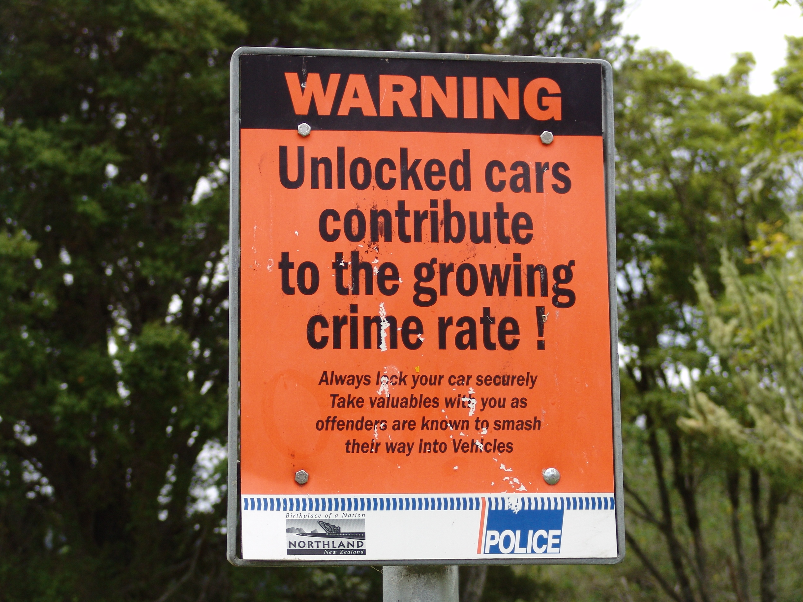 Road crimes in the Kiwi land seems to be a major concern (perhaps at least to the authority.) As in many other places, trust in people is also a diminishing thing. From the store fronts in the city, to car parks in national parks and various sight seeing places, to honey stall along the country motorways, there were a variety of warning signs helping to keep us all out of troubles. The irony, or may be the motivation of all this, vandalism, remain unattended in national parks (see photo below), now becoming a human addition to the scenic view of the country.