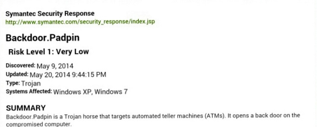 Getting back to the ATM incident in Malaysia, the vendor has responded as reported in the news that the banks were warned four months ago. It’s almost a week’s past since the publicity of the ATM attacks incident involving the Trojan malware, the risk information at the Symantec site has remained as “Updated: May 20th, 2014 9:44:15 PM” (as seen at the time of this writing), October 5, 2014 11:50 PM. Apparently, there’s no continuous risk assessment for such threat at its information source either.