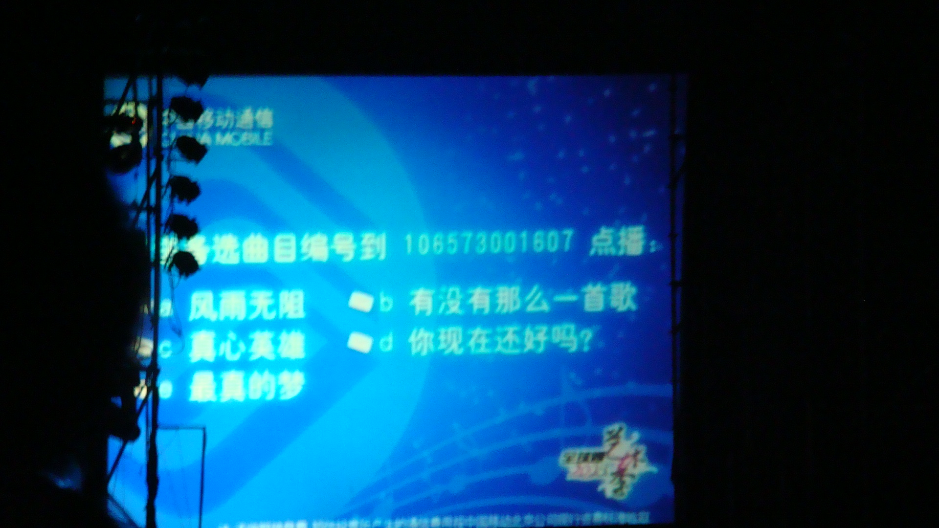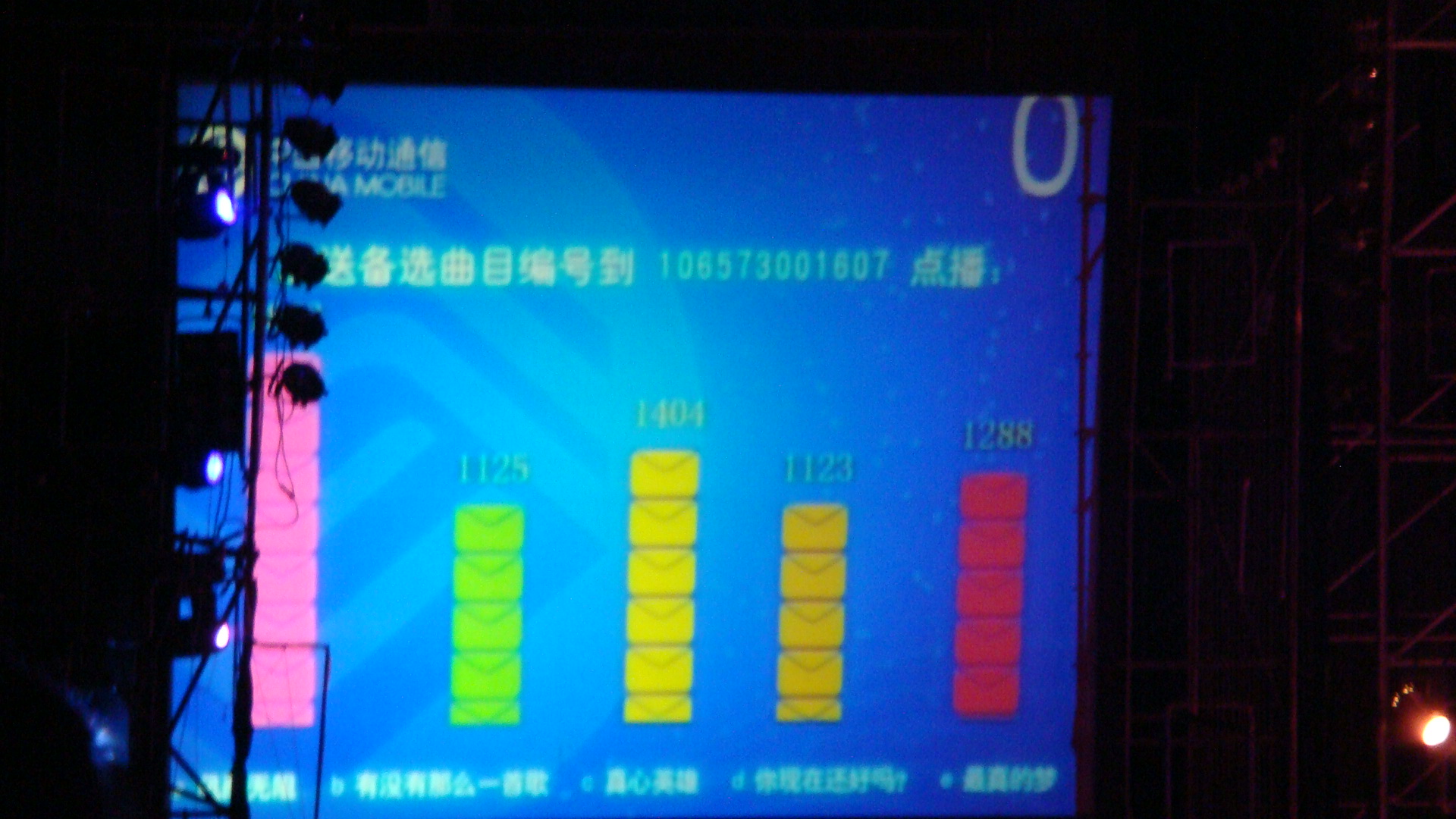 At the stage, there were a number of screens set up for different images and video projections throughout the concert to provide multimedia effects to the songs and improve the ambient of the event. At two separate intervals during the concert, the extreme left and right screens were used for another purpose, like what I saw in the previous conference in Beijing. The first screen (left picture below) shown a mobile number and five song titles put up for the audience to vote using SMS, live. Subsequently, while Zhou Huajian was singing, the SMS messages were received, and the results of those votes were counted and projected (right picture below.) Very quickly, Zhou got the results and knew exactly what are the live audience’s preferences for the next few songs, and he sang the top two selections in the sequence of popularity reflected through the SMS votes.